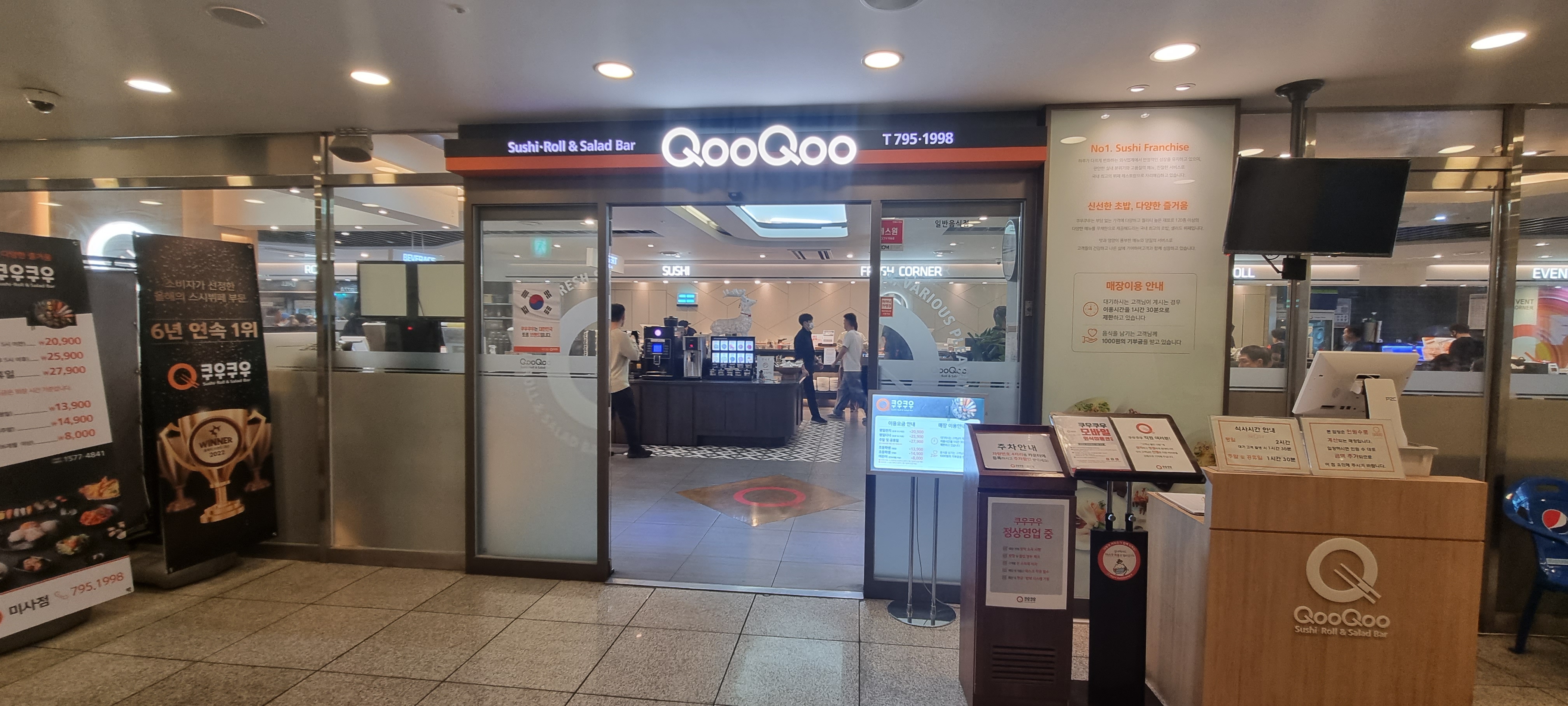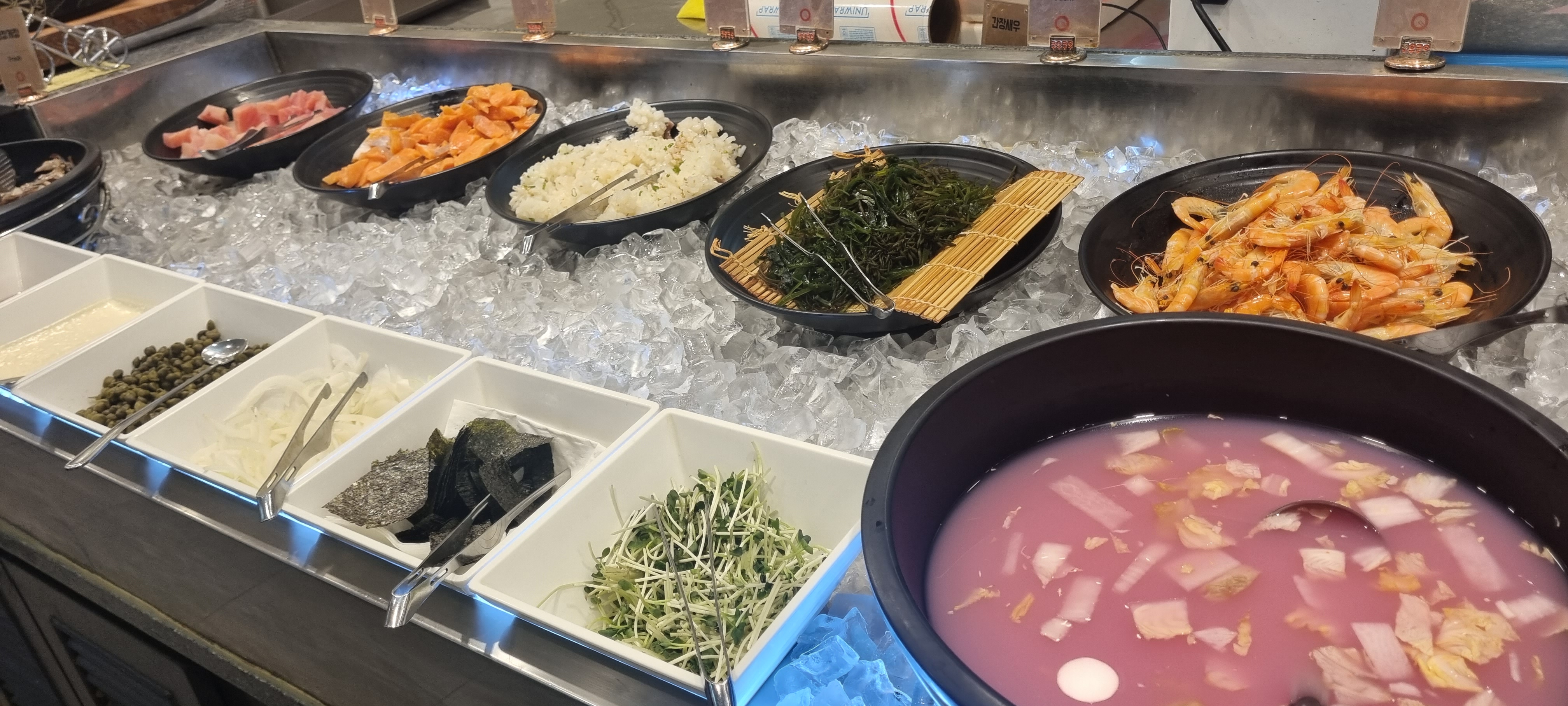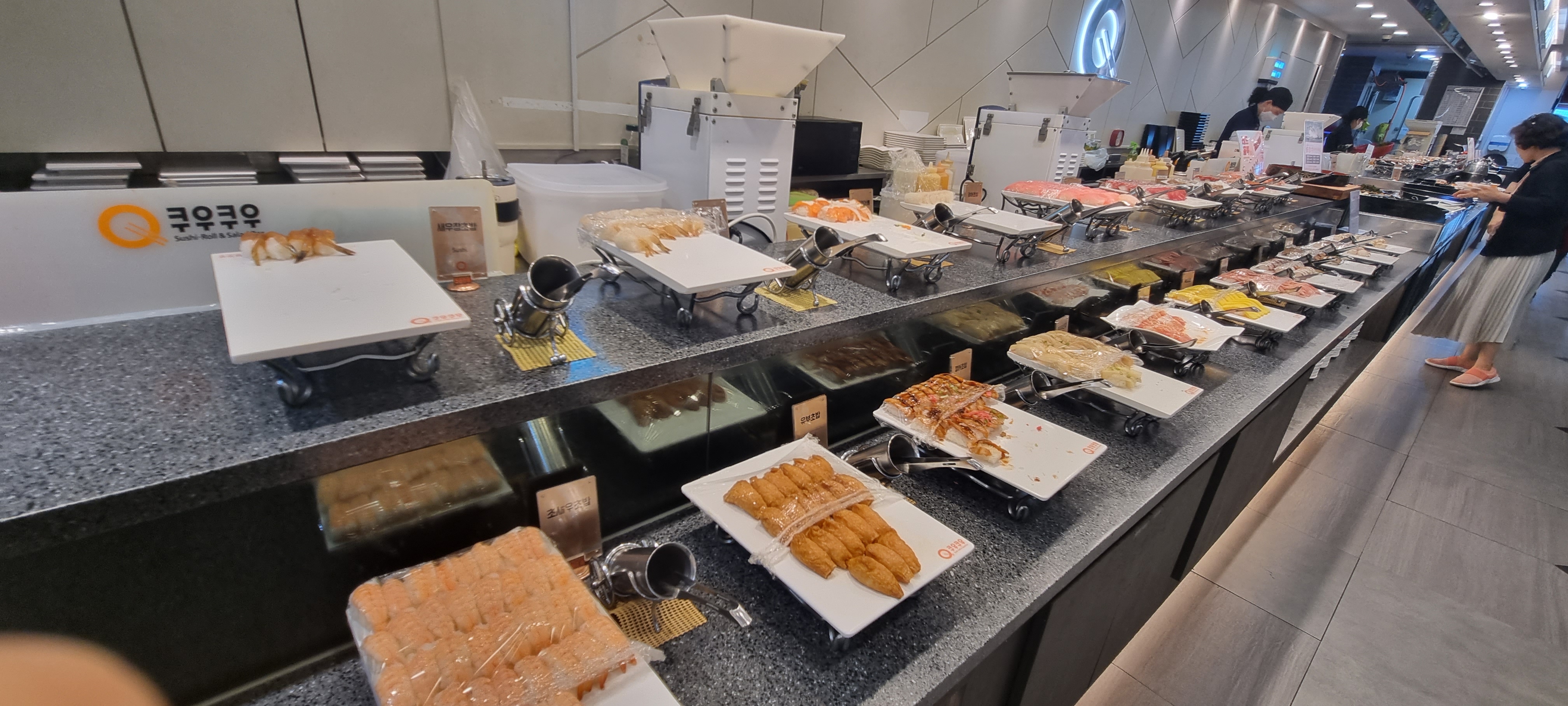 쿠우쿠우는 초밥이 메인이라 초밥부터 살펴봤어요. 신선하고 다양한 초밥들이 가득했어요.