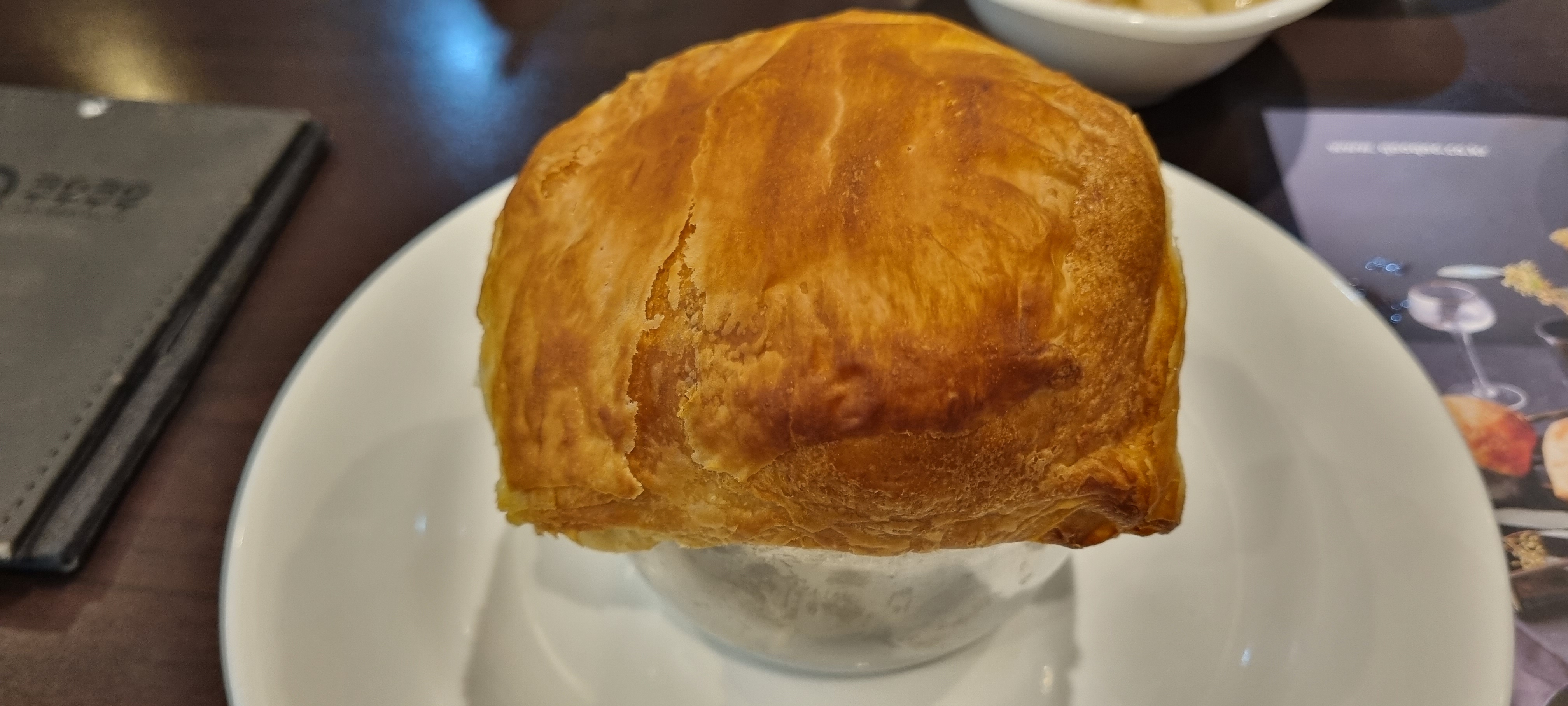 요거 이름이 뭔지 모르겠는데 그릇 위에 빵이 있는 거였어요. 빵을 가운데 가르면 수프가 나왔어요.