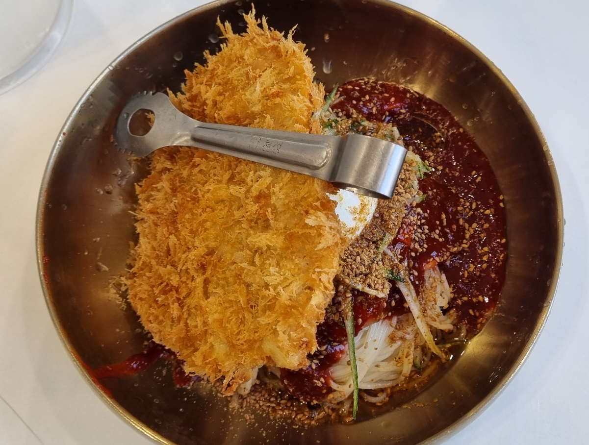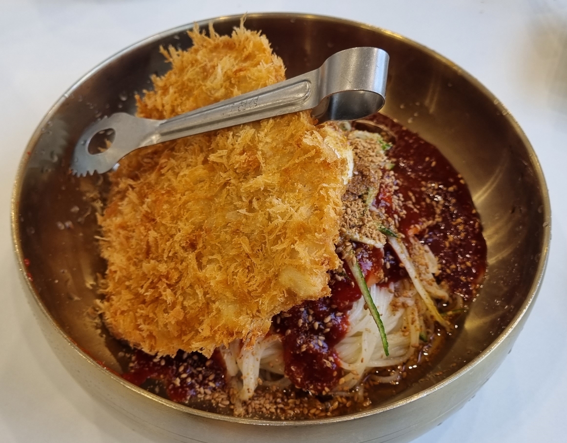 손님이 별로 없어서인지 주문하고 얼마 있다 곧바로 주문한 비돈이 나왔어요. 먹음직스러운 돈가스가 비빔밀면 위에 얹어져 있었어요.