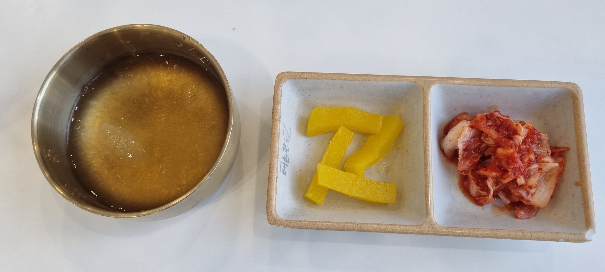 주문을 하니 서빙로봇이 먼저 냉육수와 단무지, 김치를 주더라고요.