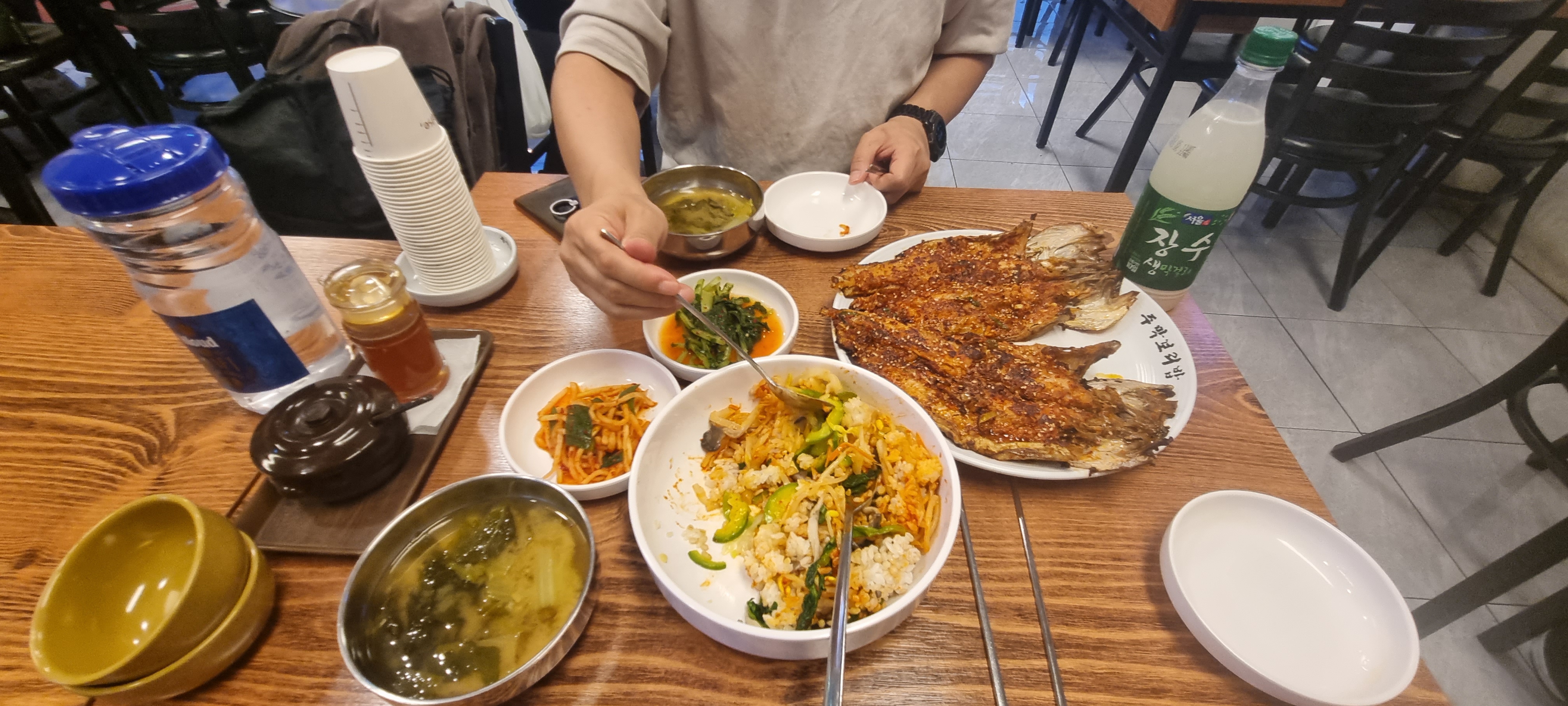 보리밥이 9천 원이었는데 보리밥이랑 호박무침 시금치 버섯볶음 콩나물 도라지무침을 주시더라고요. 시래깃국은 코다리구이 서비스고요.