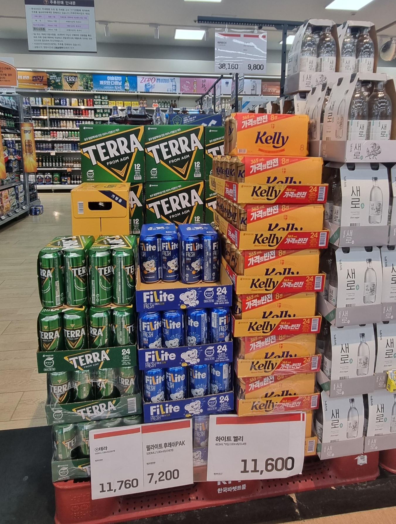 켈리 맥주 가격은 캔 1개 500ml 기준 8개 11600원에 판매하고 있더라고요. 테라와 가격차이는 크지 않았어요.