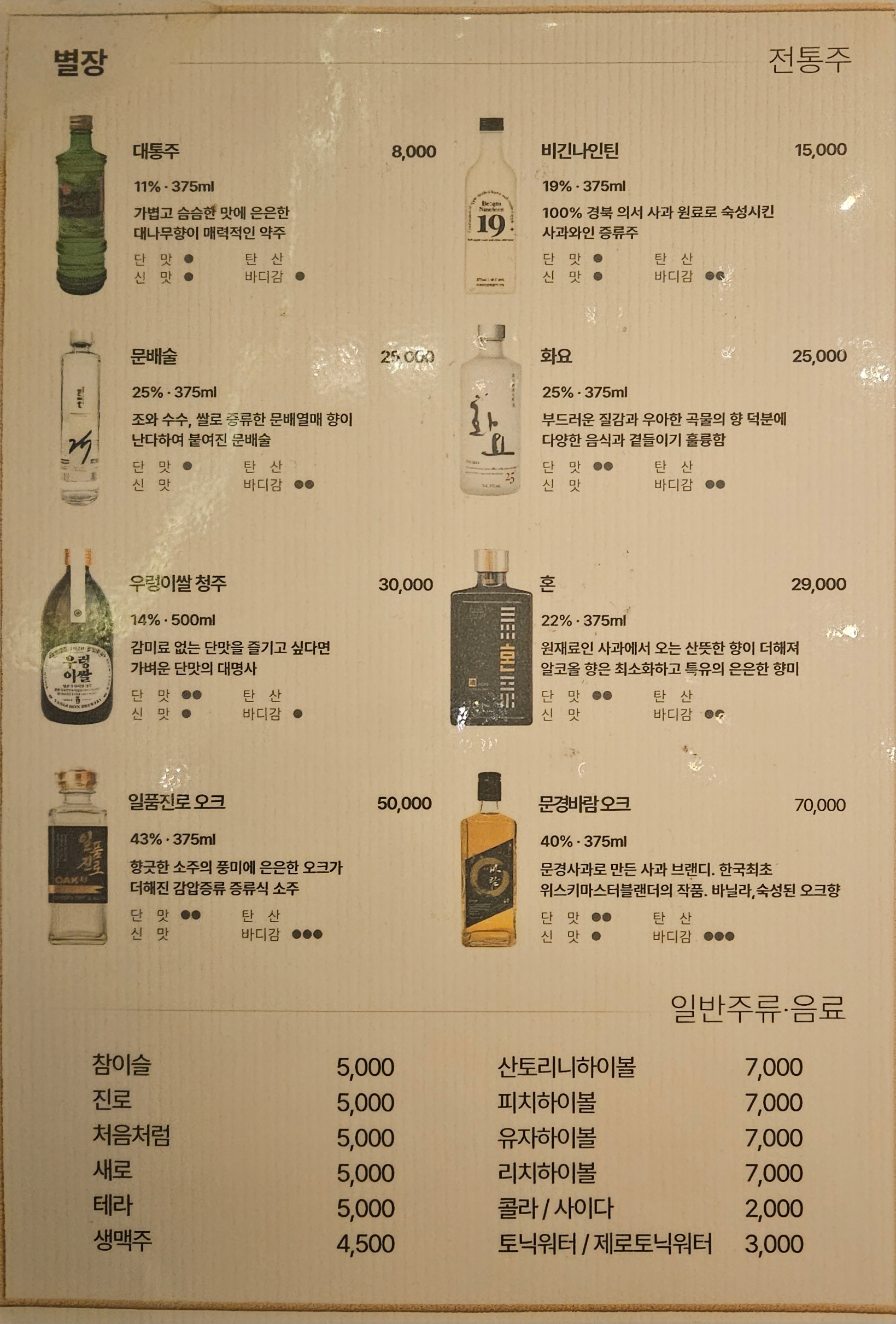 전통주: 대통주, 문배술, 화요, 혼, 일품진로 오크 등
