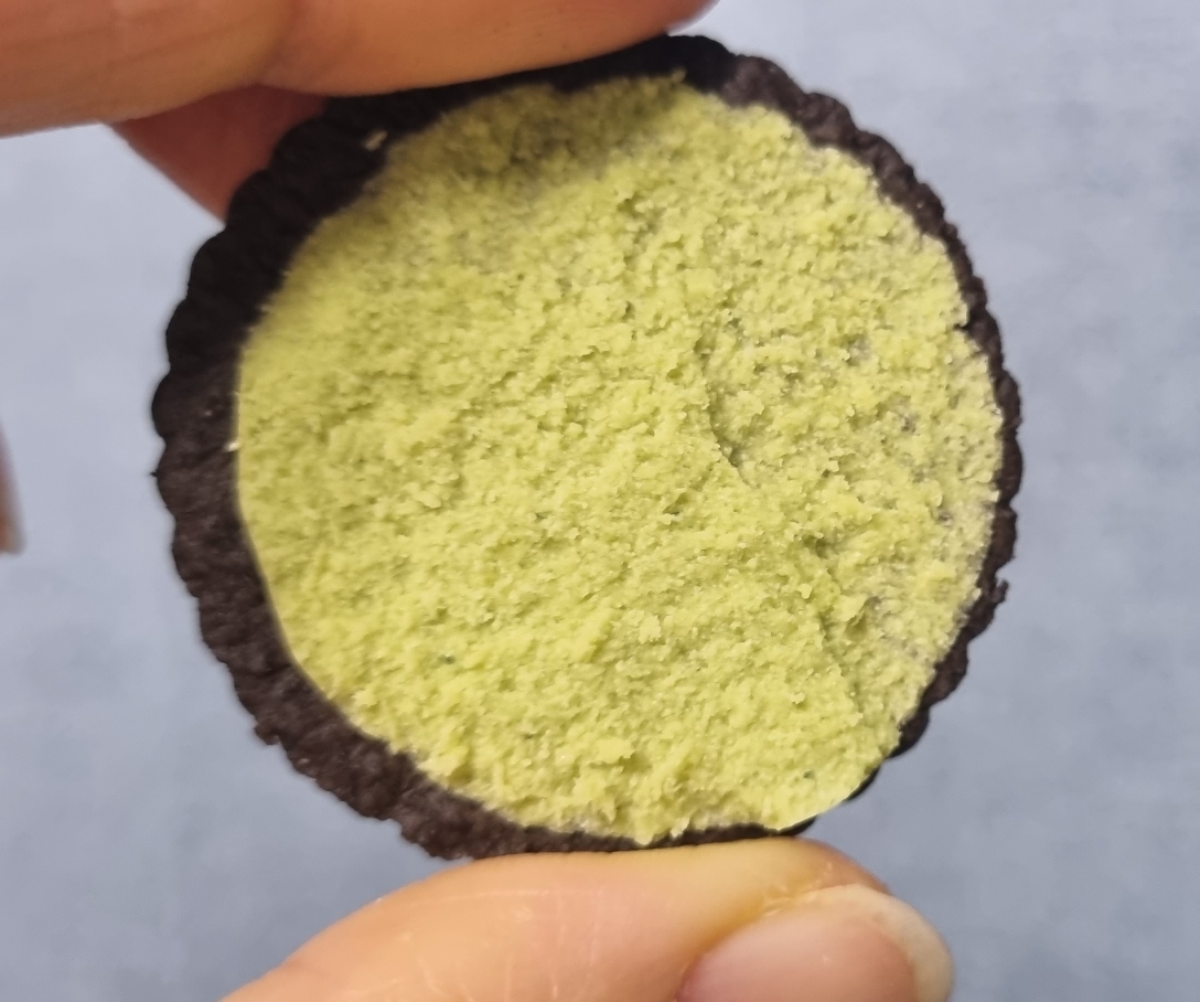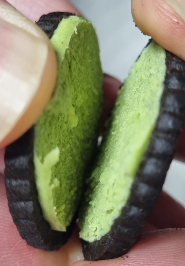 샌드 안을 살짝 열어봤어요. 녹차 크림이 발라져 있더라고요. 가공식품이라 아주 부드러운 크림은 아니였어요. 반을 가르는데 잘 안떨어지더라고요.