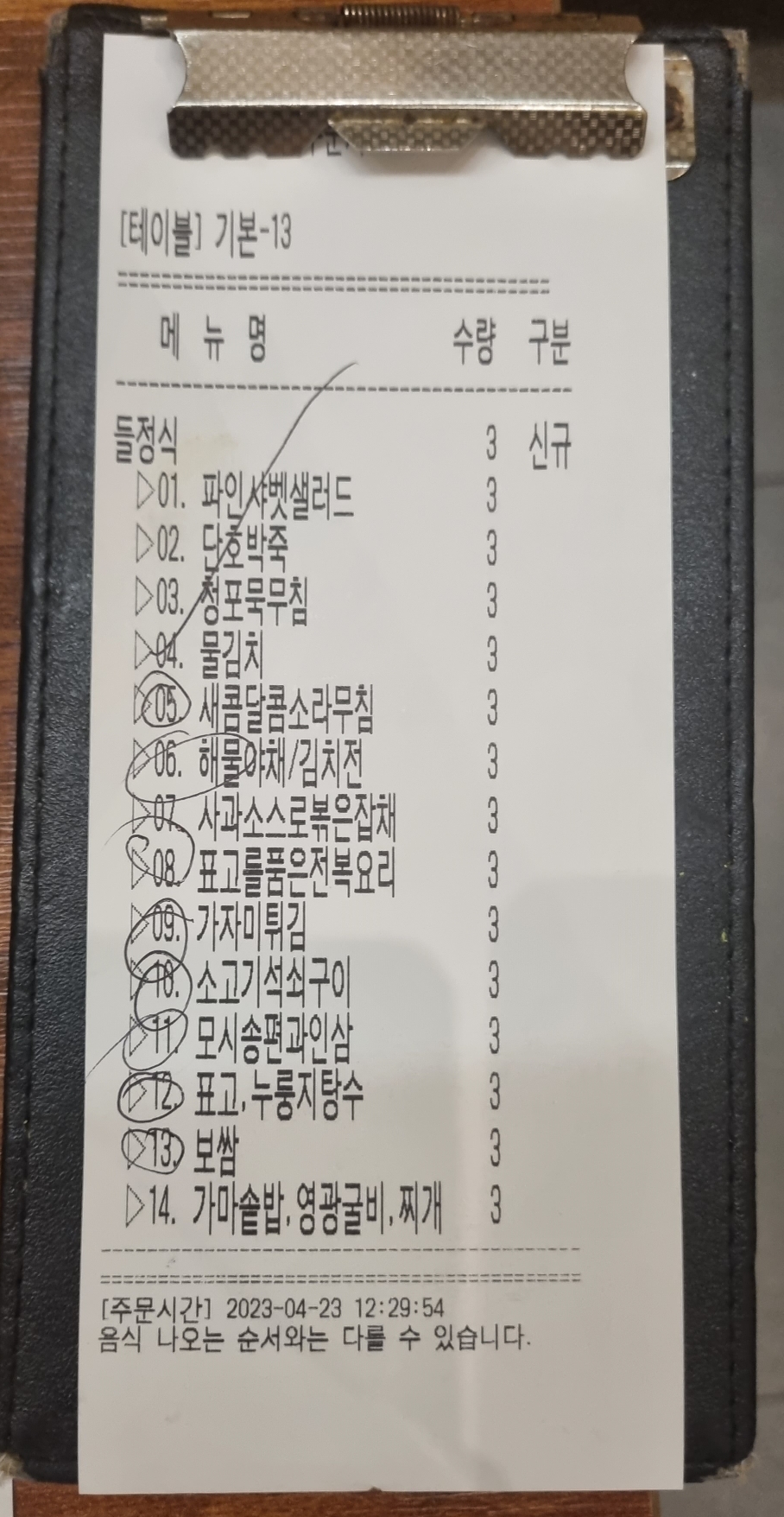 저희가 주문한 메뉴는 들정식 코스였어요. 음식들이 엄청 많이 나와서 뭐가 뭔지 모르겠더라고요. 그래서인지 계산서에 코스요리가 순서대로 표시되어 있더라고요. 참 좋은 방법인 것 같더라고요.