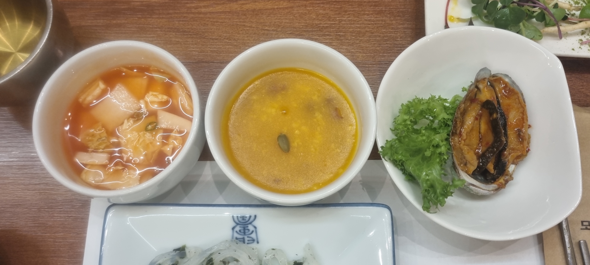 식전 파인샤벳 샐러드가 입맛을 돌게 하더라고요. 단호박죽이랑 물김치는 단호박의 단맛을 물김치로 잡아주는 느낌이었어요. 청포묵무침은 부모님이 좋아하셨어요.