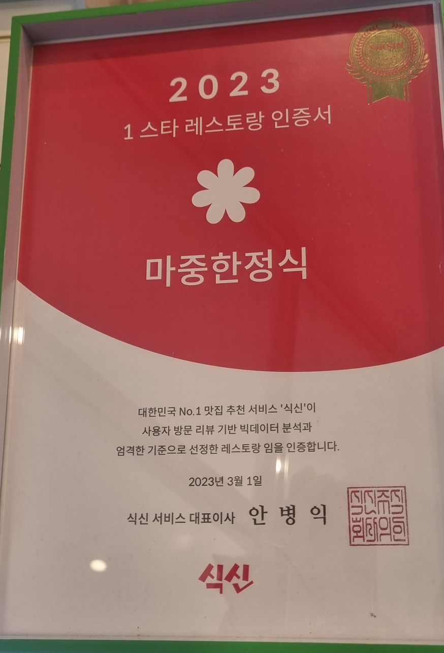 예약을 깜빡해서 당일 오전 <마중> 가는 길에 예약 전화를 걸었더니 마감됐더라고요. 이미 고속도로는 탔기에 무작정 갔어요. 다행히도 도착하고 조금 기다리다 보니 노쇼가 생겨서 식사를 할 수 있게 됐어요. 식당 입구에 들어서니 손님도 꽉 차 있고 상장도 많더라고요. 빨리 먹고 싶더군요.