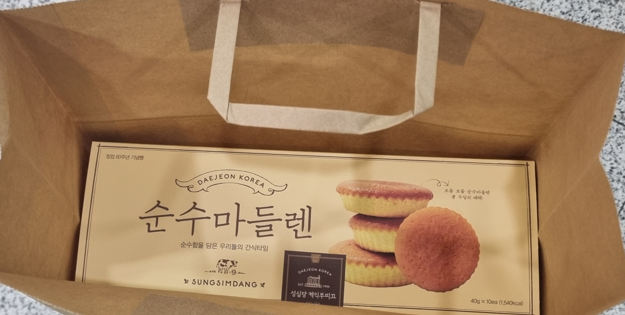 순수마들렌은 성심당 대표 선물추천템이고요. 국산 우유를 사용해서 부러운 카스테라 형태고요. 남녀노소 호불호 없는 인기 상품이에요. 내일 친구만나서 줄껀데 맛있다고 했으면 좋겠네요.